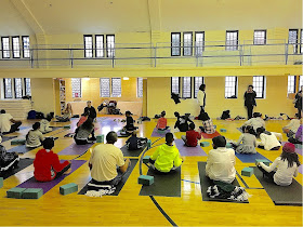 And so. Together we did yoga. Quietly finding inner peace in mountain poses, downward facing dog poses and sun salutations. The men marveled at how easily those lithe little ones folded their bodies into those Child's poses and those kids giggled when the grown ups needed foam blocks because they couldn't touch their toes.